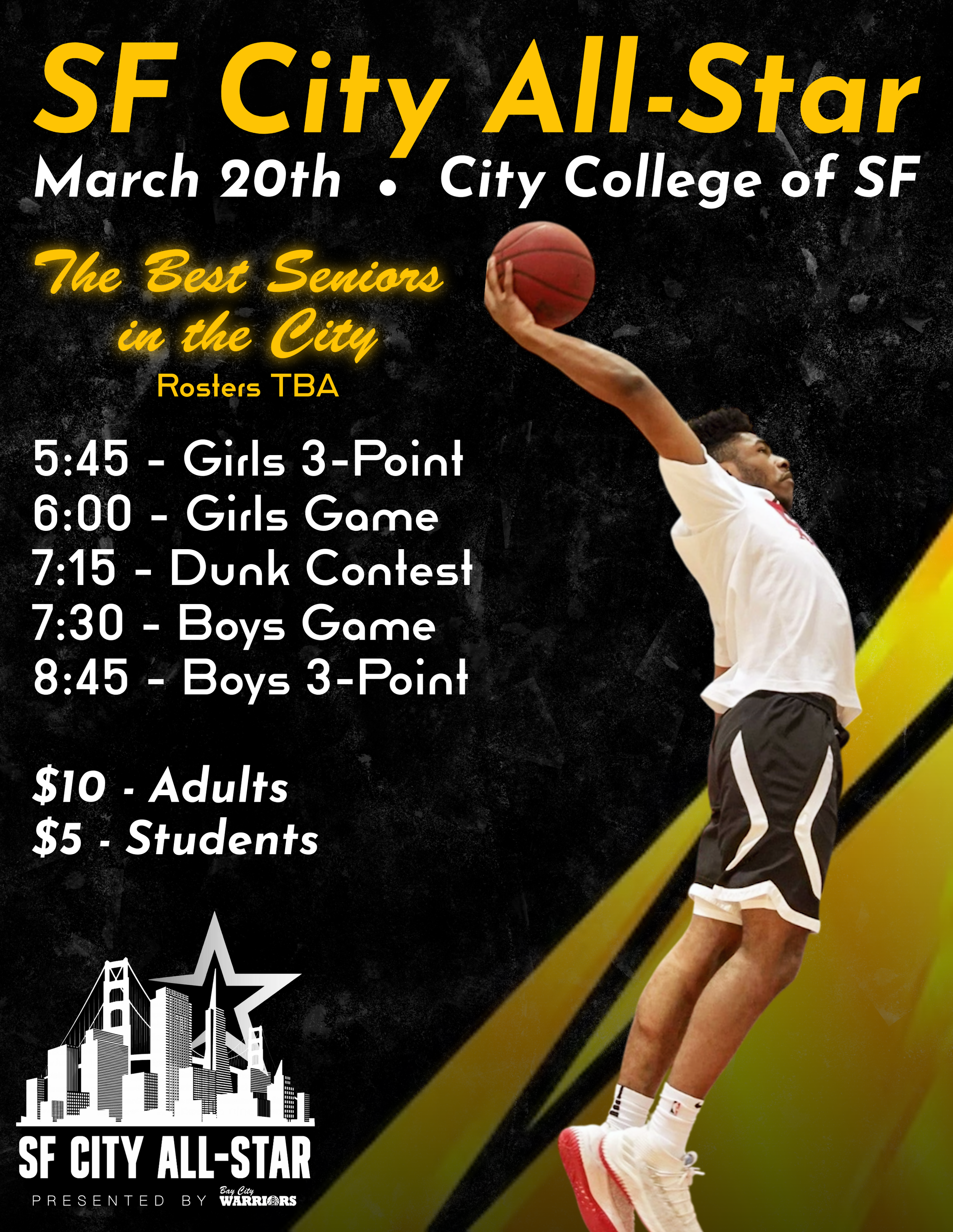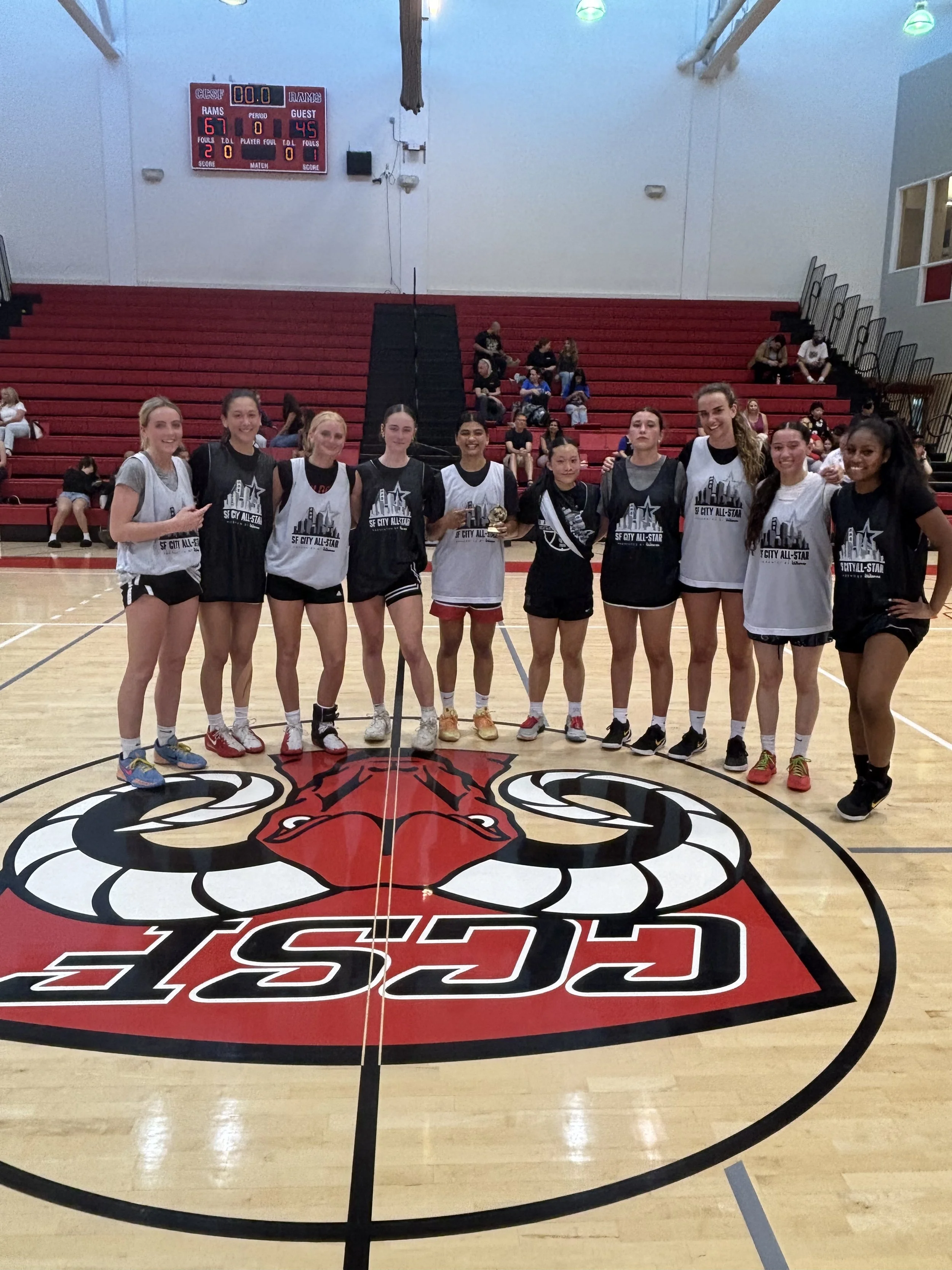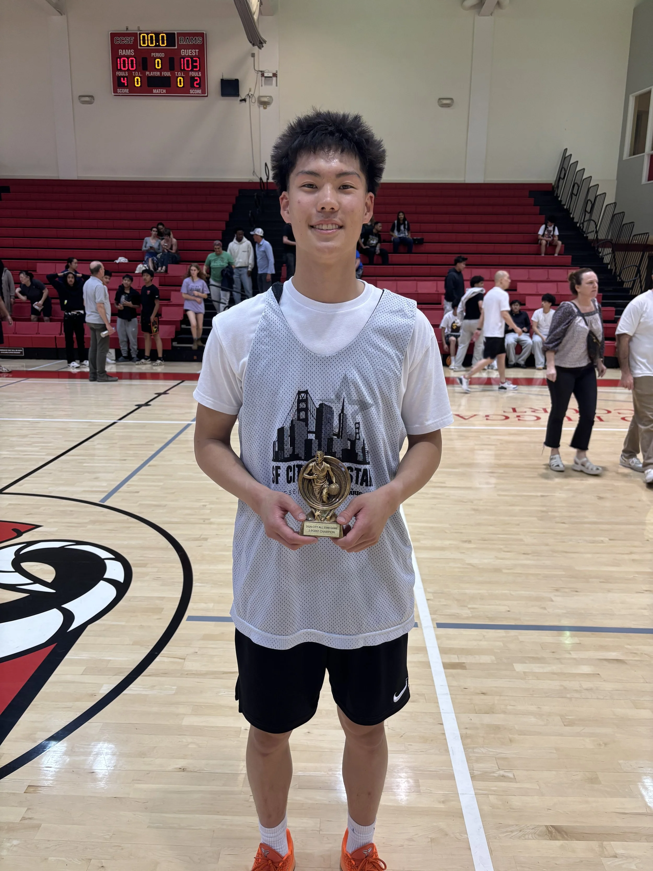 /Bay City Warriors hosted the 17th Annual City All Star Game on 3/20/26 at CCSF in Memory of Mike Gragnani. All the Seniors closed out their high school careers with a fun game that brought AAA, WCAL and BCL players together. The boys game was a 103-100 thriller won by the black team. Nisha Zemlin of International was the MVP of the Girls Game and Chloe Yan of Riordan was the 3 Point Champion. DeMarco Hunter of Riordan was the Boy’s MVP and Slam Dunk Champion. Lucas Lau of University was the Boys 3 point Champion. Thank you Seniors!
